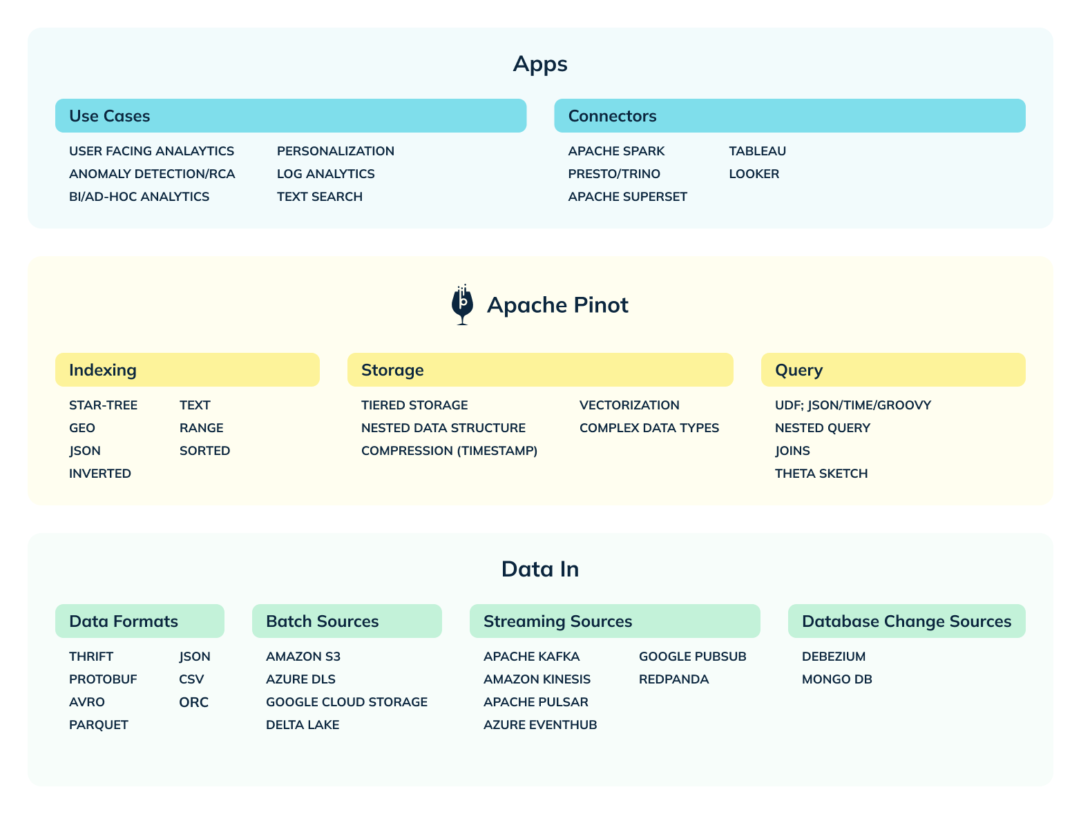 Now looking back, I am glad we undertook this as Pinot now supports a multitude of streaming (Kafka, Kinesis, Pubsub, Pulsar, Redpanda) and batch sources (HDFS, ADLS, S3, GC), diverse data formats (JSON, AVRO, CSV, protobuf), as well as multiple indexes (sorted, inverted, timestamp, range, bloomfilter, geospatial, star-tree, and text).