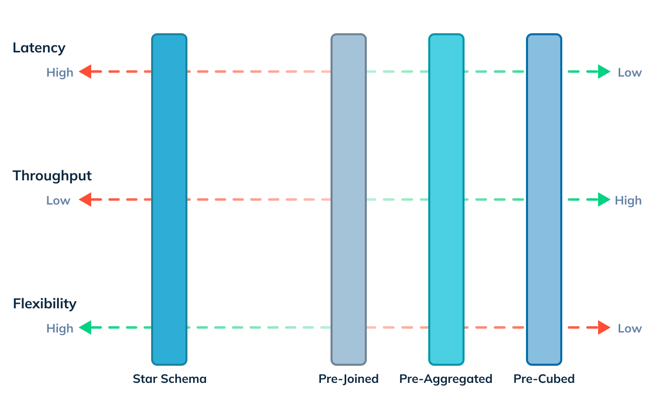 Figure 1: The various approaches when joining data – pre-cubing, pre-aggregating, pre-joining and star schema – and their implications on latency, throughput and flexibility.