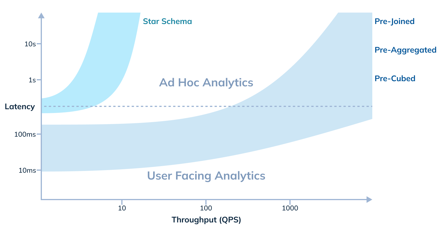 Figure 2: Ad hoc analytics – which is typically for internal users – is more accepting of higher latencies. On the other hand, user-facing analytics applications need to provide interactive and real-time experiences at end-user scale, thus requiring ultra-low latencies and very high throughput. The kind of analytics use cases that the system needs to support, will influence the choice of data modeling.