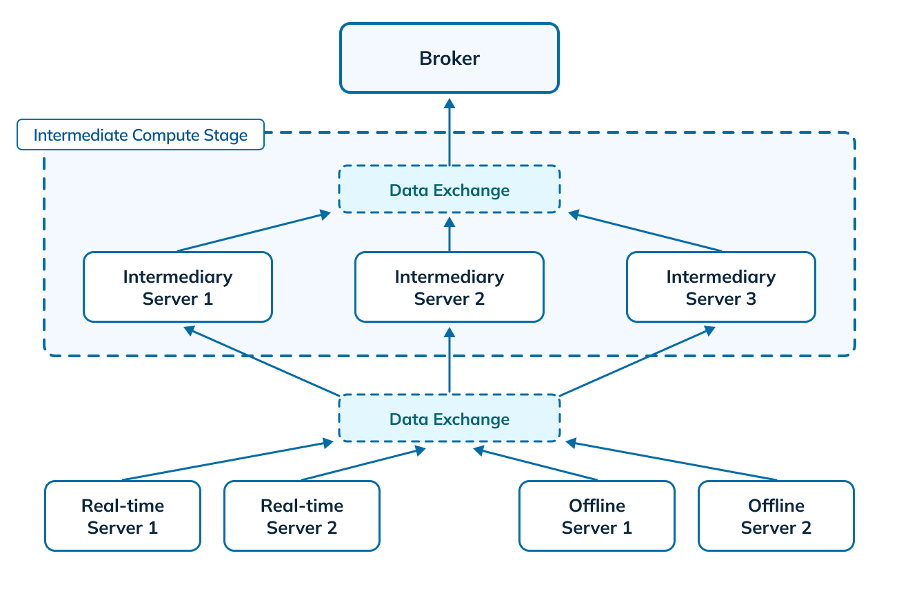 The multi-stage query engine is a generic processing framework, designed to handle complex multi-stage data processing. As part of the multi-stage execution model, we introduced a new intermediate compute stage in Pinot to handle the additional processing requirements and offload the computation from the brokers. The intermediate compute stage consists of a set of processing servers and a data exchange mechanism. We leverage the Pinot servers for the role of processing servers in the intermediate compute stage, but these can be assigned to any Pinot component. The data exchange service coordinates the transfer of the different sets of data to and from the processing servers. We also introduced a new query planner, which is designed to support full SQL semantics.