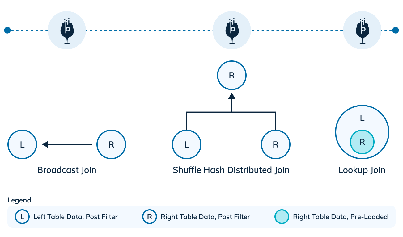 - Lookup join: Right table must be pre-loaded (replicated) on all nodes of left table. This can only work for very small right hand datasets.
