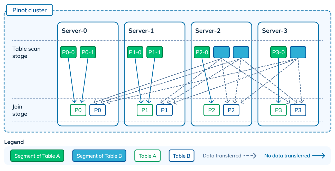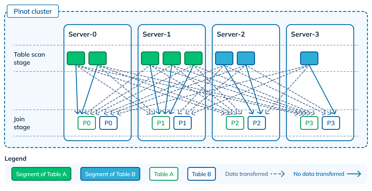 When implementing JOINs in Pinot, the design principle we followed was to do the least amount of work wherever possible by reducing the overhead of scans and minimizing the data shuffle. In each stage we have focused on adding optimizations to reduce the amount of such work done.