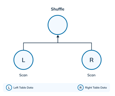 - Shuffle distributed hash join: After applying filters, data from both sides (L and R) is hashed on the join key and shipped to an independent shuffle stage (effective data moved L + R). This scales well even if the size of data on either side increases. Plus, the performance is unaffected by the number of nodes on either side.